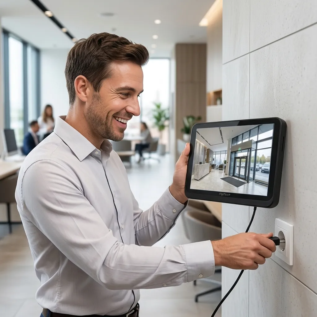 Усмихнат мъж лесно инсталира 10.1-инчовия тъч екран на 8-каналната WiFi NVR система FipTec X-View в офис. Насладете се на сигурност без сложни системи и пълен контрол.