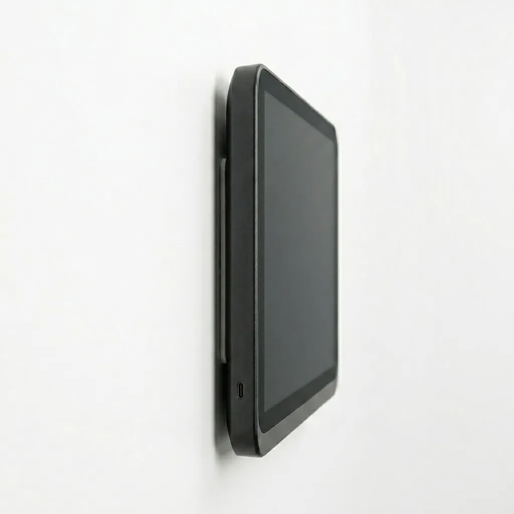 Страничен профил на 10.1-инчовия тъч екран на WiFi NVR система FipTec X-View, монтиран на бяла стена. Тънък и елегантен дизайн за дискретна сигурност и лесен контрол на вашия дом.