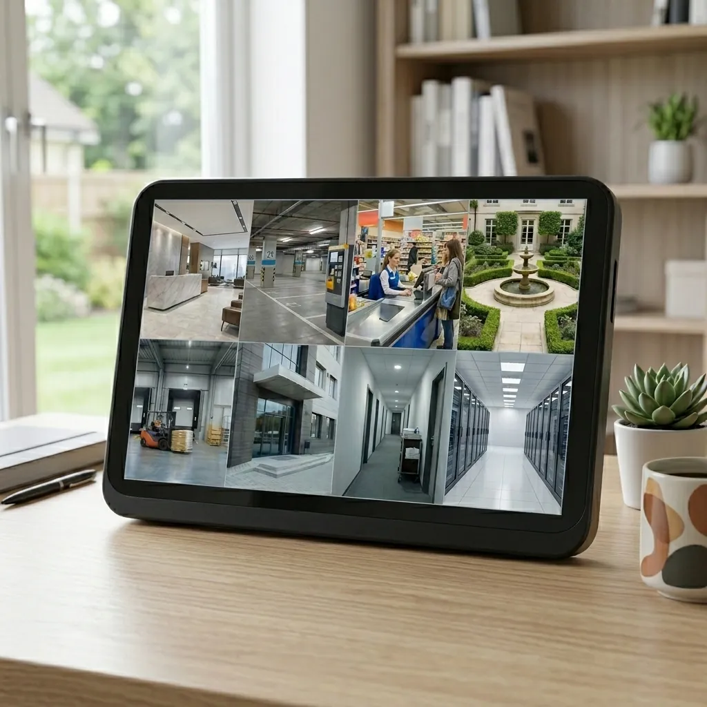 Снимка на FipTec показваща 10.1-инчовия тъч екран на 8-каналната WiFi NVR система X-View върху бюро в модерен офис с изглед към градина. Екранът предава 8 охранителни камери, гарантирайки дискретна сигурност и спокойствие.