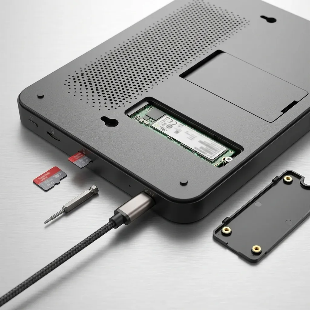 2. Вътрешен SSD Слот (M.2 тип): За сериозен и дългосрочен архив, устройството разполага с вътрешен слот за SSD диск. Важно пояснение: Този слот не е за старите големи 2.5-инчови дискове, а за модерните компактни SSD дискове на „платка“ (формат M.2), които визуално наподобяват RAM памет.