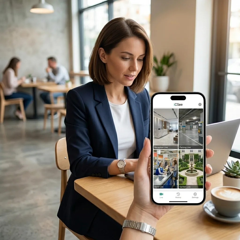Жена в офиса, наблюдаваща дистанционно охранителните камери през мобилно приложение на 8-канална WiFi NVR система FipTec X-View. Пълна защита на собствеността и лесен контрол за вашето ежедневно спокойствие.