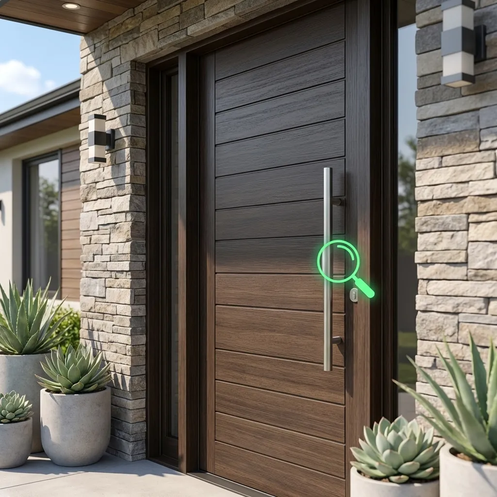 Елегантна дървена входна врата с каменна облицовка и саксии, върху която икона на лупа акцентира върху сигурността на входа. Това е дискретно решение за охрана от FipTec за вашето спокойствие.