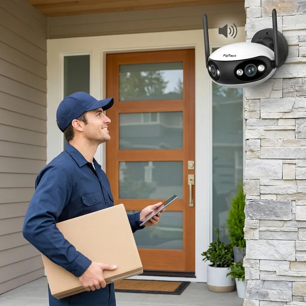 Доставчик с пратка пред входната врата комуникира през панорамната външна камера FipTec LO18 с двустранно аудио, гарантирайки пълна сигурност и лесен контрол за вашето пълно спокойствие.