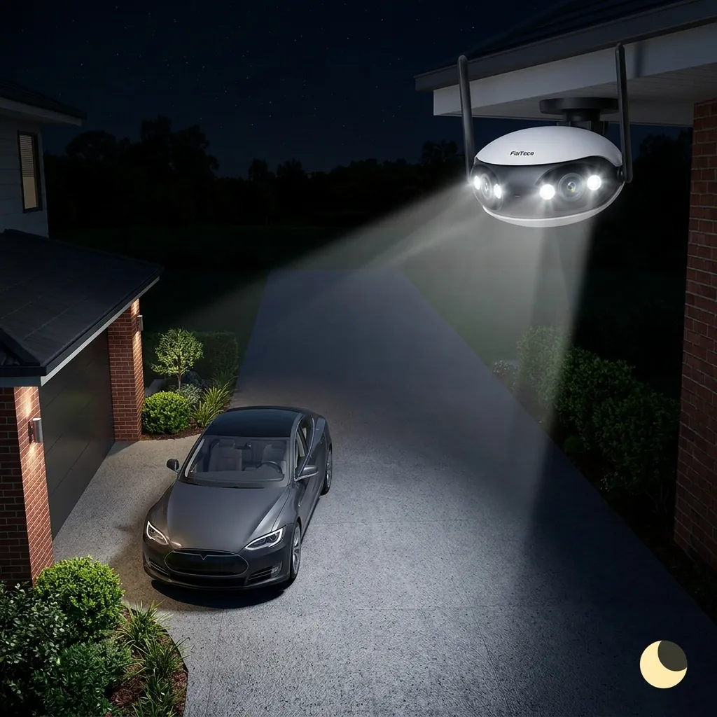 Външна панорамна WiFi камера FipTec LO18 с мощни LED прожектори осветява автомобил в тъмна алея, осигурявайки надеждна нощна охрана и пълна сигурност за вашето спокойствие.