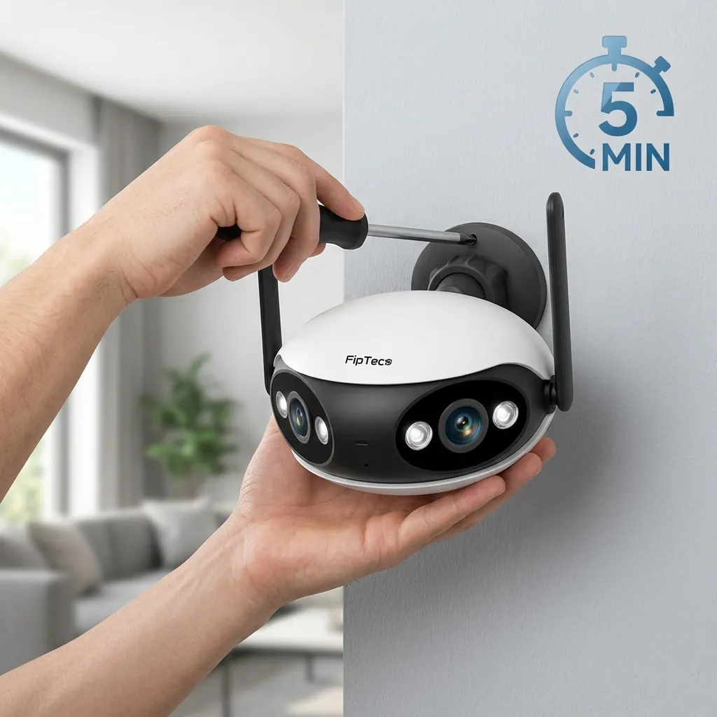 Ръце монтират панорамна WiFi камера FipTec LO18 на стена с отвертка за бърза петминутна инсталация, осигурявайки надеждна защита и сигурност без сложни системи за вашето пълно спокойствие.