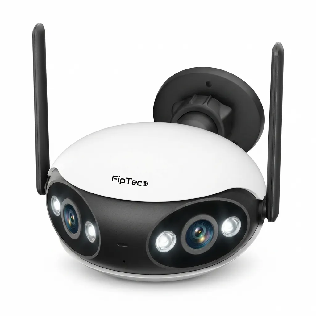 Панорамна WiFi камера FipTec с двоен обектив и антени на чист бял фон, предоставяща широкоъгълна охрана за дома и пълна сигурност с изключително лесен контрол.