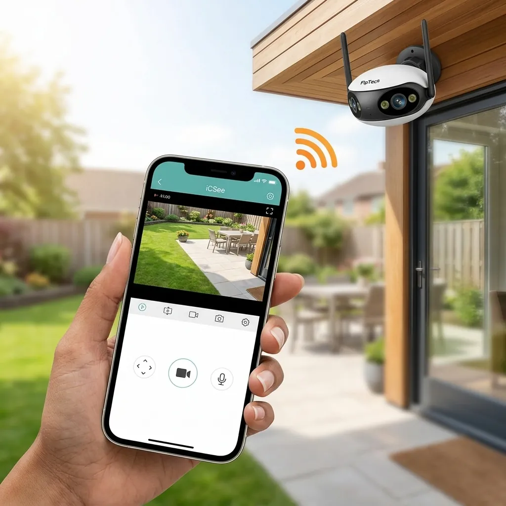Ръка държи смартфон с приложението iCSee, показващо картина на живо от панорамна WiFi камера FipTec в двора, осигурявайки лесен смарт контрол и надеждна защита за вашето пълно спокойствие и сигурност.